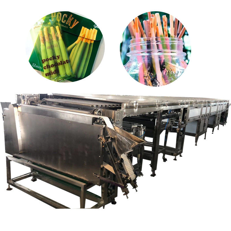 Całkowicie automatyczna maszyna do zanurzania i nakładania czekolady na ciasteczka z palcami Pocky Sticks przyjmuje elektryczne, gazowe i fotoelektryczne sterowanie, z wysokim stopniem automatyzacji,równomierny poziom płynu powłoki zanurzającejPo pierwszym powłokę materiał granulowy jest posypany, a następnie lekko schładzany, a następnie wykonuje się drugą powłokę,Następnie wchodzi do tunelu chłodzącego..